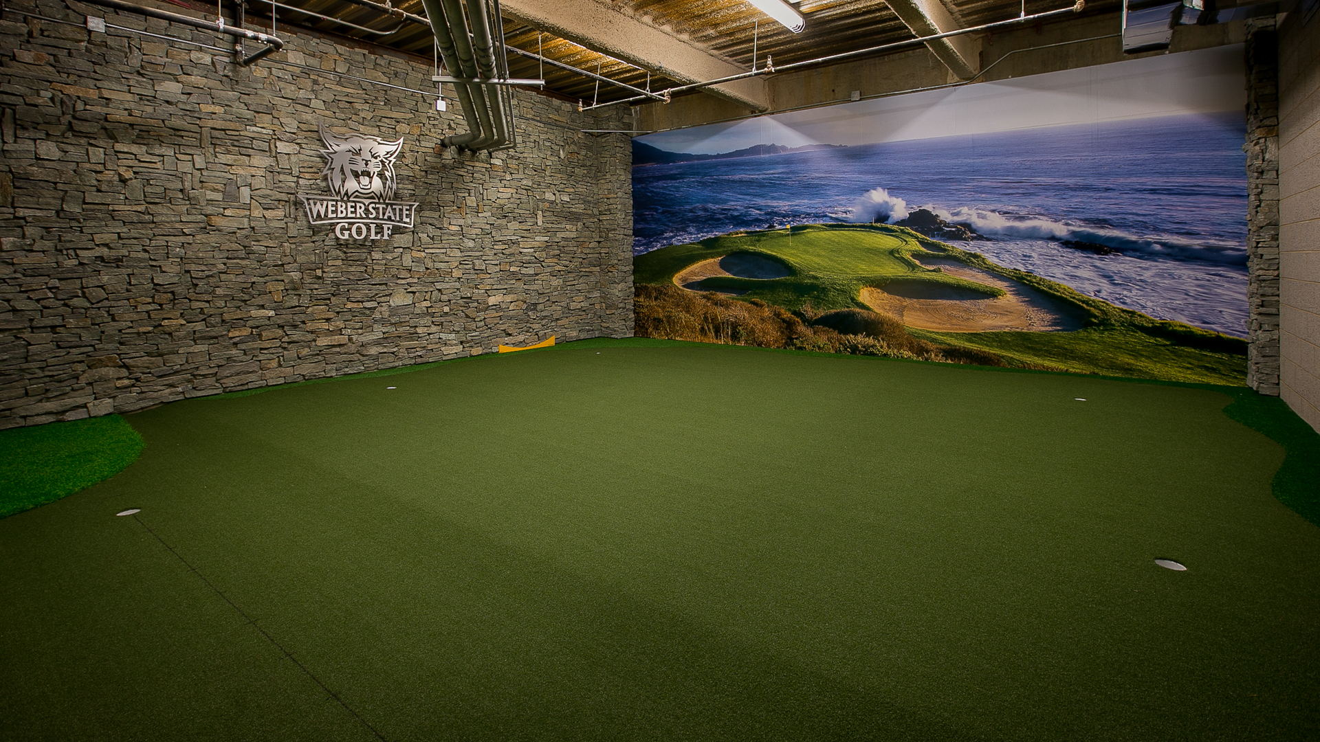 The ball-striking portion of the space includes a netted hitting bay and a TruGolf premium golf simulator with an HD projector, touch screen monitor and dozens of world-class golf course layouts, which are displayed on an 8' x 12' screen.