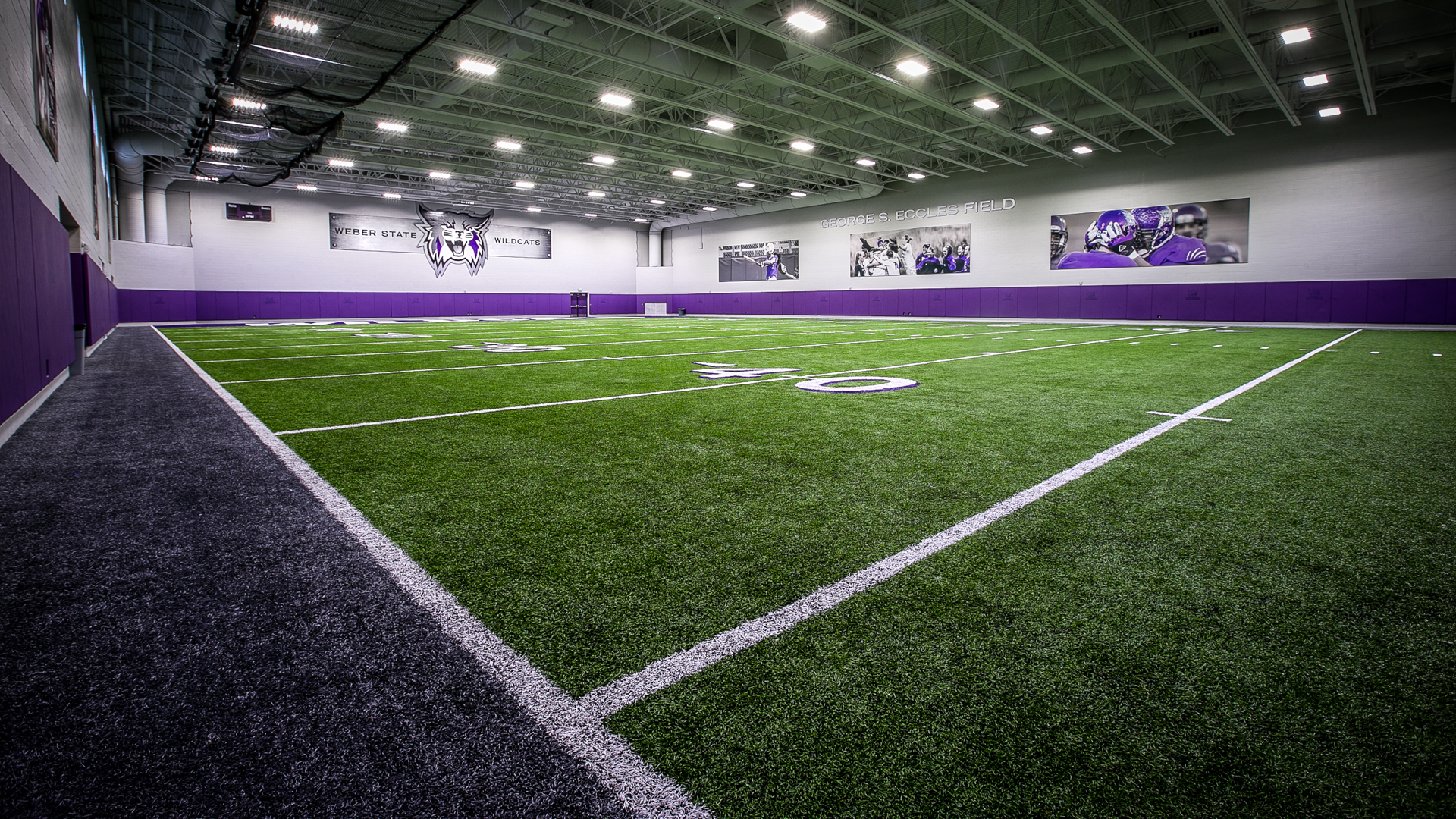 On the upper floor of the Field House is a 60-yard indoor practice field, known as the George S. Eccles Field. The synthetic turf field is marked to accommodate football, soccer and softball. In addition, the facility also includes a state-of-the-art strength and conditioning complex, which accommodates athletes from multiple WSU sports. The complex also includes an additional exercise room overlooking the field.